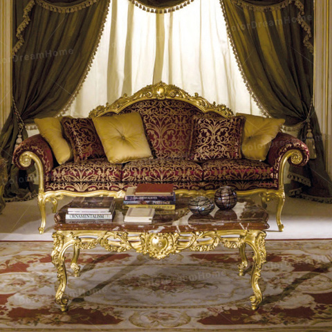 유럽 로얄 빈티지 패브릭 소파 세트 거실 단단한 나무 거실 가구 빨간색과 금색 판매